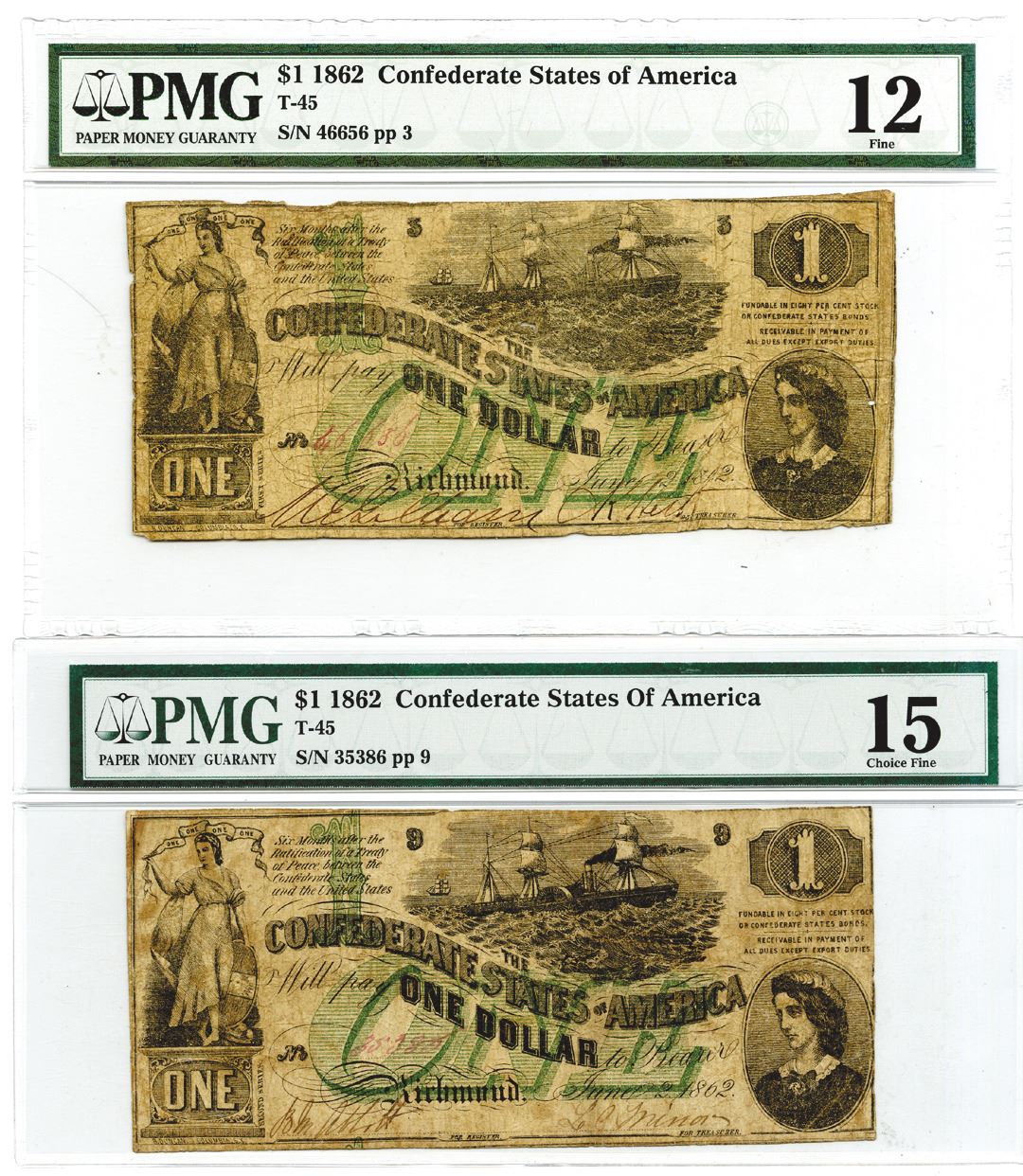 Richmond, VA. Lot of 2 notes. Includes June 2nd, 1862. $1, T-45, Issued banknote, S/N 46656 pp 3, PMG graded Fine 12; and, June 2nd, 1862. $1, T-45, Issued banknote, S/N 35386 pp 9, PMG graded Choice Fine 15. (2)