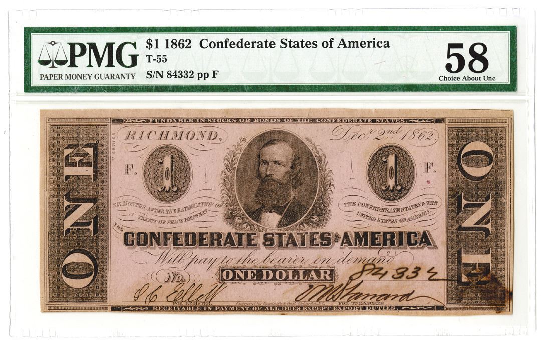 Richmond, VA. Dec. 2nd, 1862. $1, T-55, Issued banknote, S/N 84332 pp F, PMG graded Choice About Unc 58. Attractive note with 3 large and one ample margin. K&B.