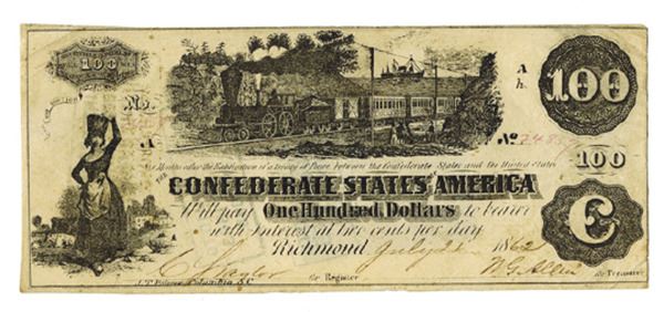 Richmond, VA. July 21, 1862, $100, Issued, Black with train with straight steam, Interest Paid overprints on back, 1863, 1864 and January 1, 1865, all in Richmond. XF-AU. Printed by Paterson,