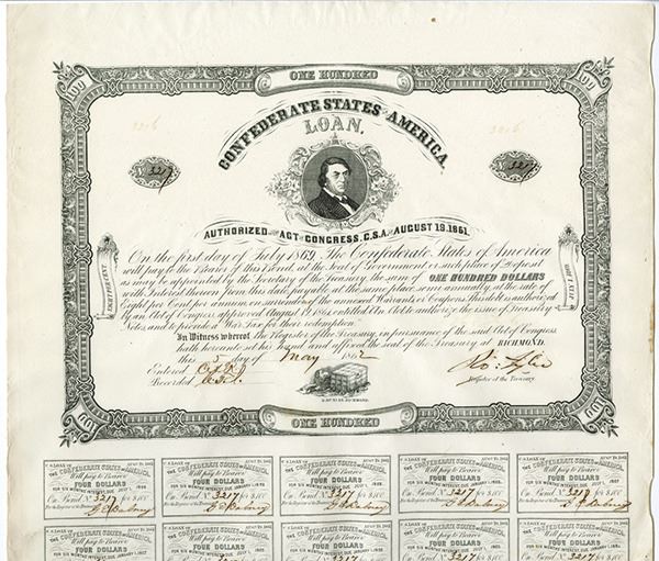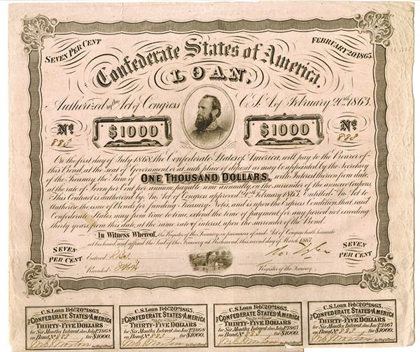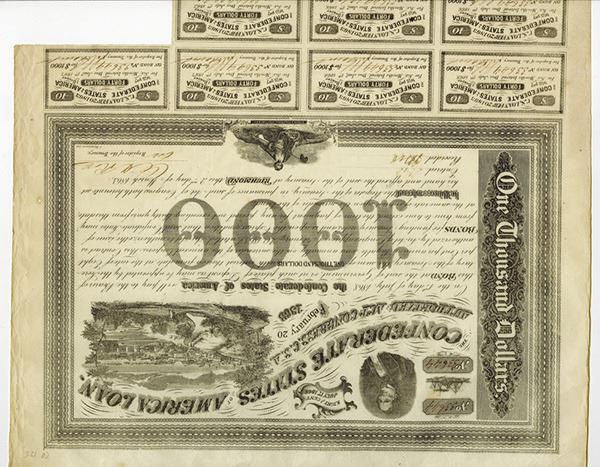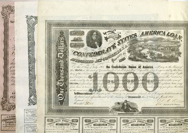 Richmond, Virginia, Lot of 3 bonds, Includes 1862, $100, Signed by Tyler, 10 coupons attached; 1863, $1000, 9 coupons attached, black on pink paper; and $1000, 1863, all are in Fine to VF condition.