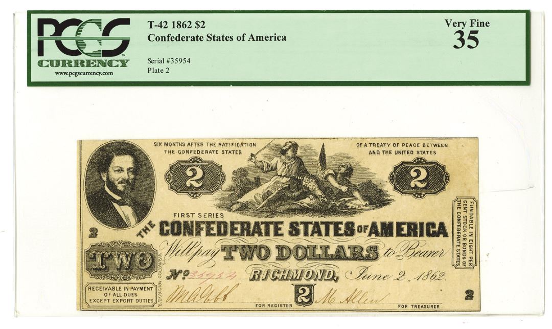 Richmond, VA. June 2nd, 1862. $2, T-42, Issued banknote, S/N 35954 Plate 2, PCGS graded Very Fine 35.