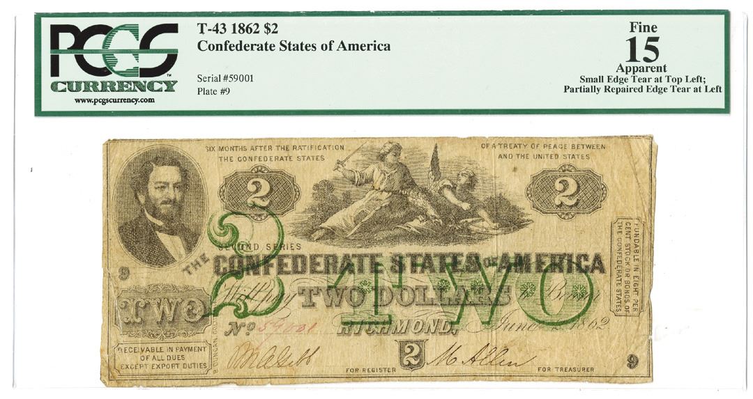 Richmond, VA. June 2nd, 1862. $2, T-43, Issued banknote, S/N 59001 Plate #9, PCGS graded Fine 15. Apparent small edge tear at top left, Partially repaired edge tear at left.