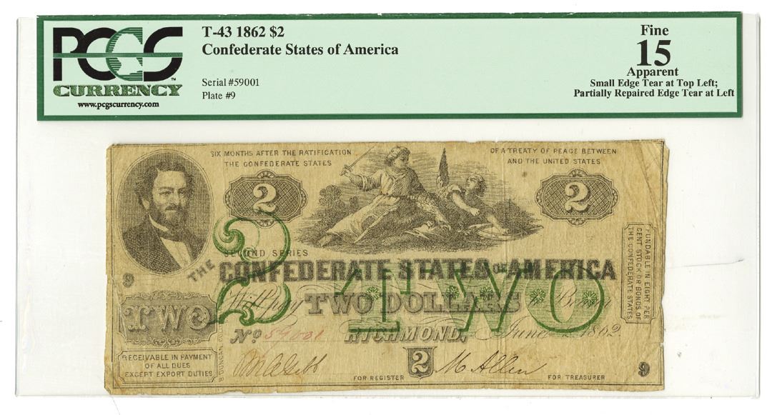 Richmond, VA. June 2nd, 1862. $2, T-43, Issued banknote, S/N 59001 Plate #9, PCGS graded Fine 15. Apparent small edge tear at top left, Partially repaired edge tear at left.