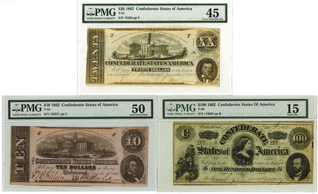 Richmond, VA. Lot of 5 notes. Includes December 2nd, 1862. $10, T-52, Issued banknote, S/N 132371 pp C, PMG graded About Unc. 50; December 2nd, 1862. $20, T-51, Issued banknote, S/N 15589 pp F, PMG graded Choice Extremely Fine 45; December 2nd, 1862. $100, T-49, Issued banknote, S/N 118032 pp B, PMG graded Choice Fine 15; December 2nd, 1862. $5, T-53, Issued banknote, S/N 8477 Plate #H, PCGS graded About New 50; and, December 2nd, 1862. $20, T-51, Issued banknote, S/N 69167 Plate #F, PCGS graded Extremely Fine 40. (5)