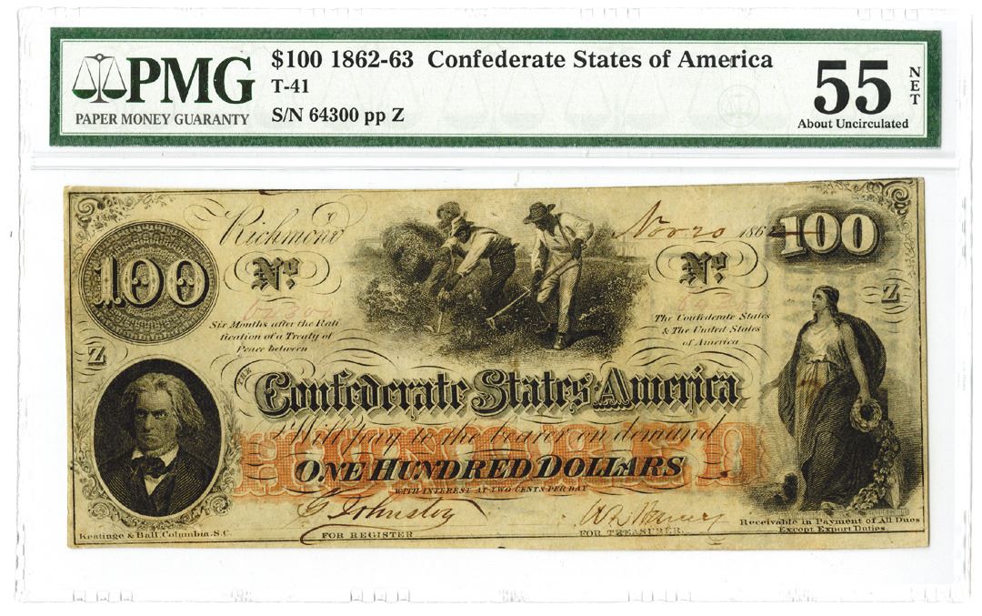 Richmond, VA. November 20th, 1862. $100, T-41, Issued banknote, S/N 64300 pp Z, PMG graded About Unc 55 Net. Annotation Stains. K&B.