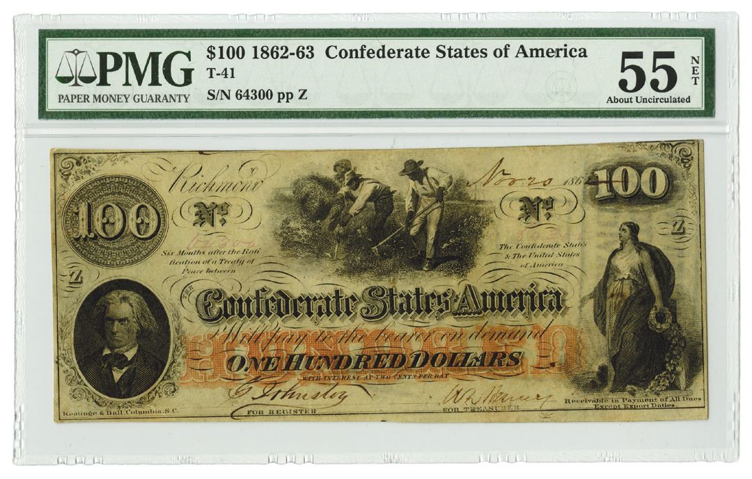 Richmond, VA. November 20th, 1862. $100, T-41, Issued banknote, S/N 64300 pp Z, PMG graded About Unc 55 Net. Annotation Stains. K&B.