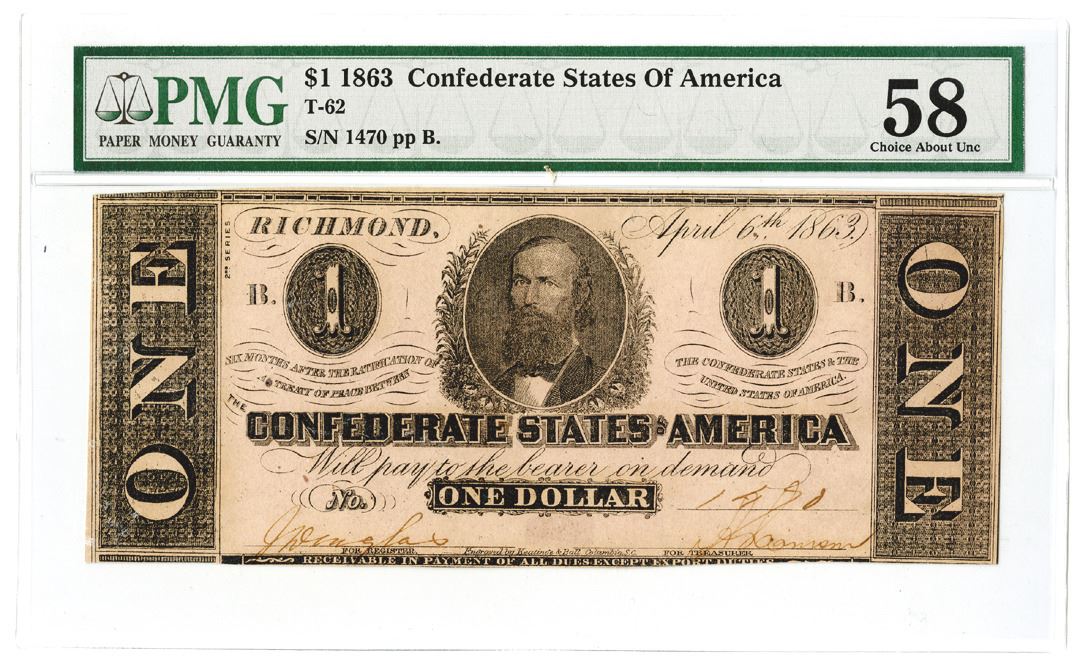 Richmond, VA. April 6th, 1863. $1, T-62, Issued banknote, S/N 1470 pp B, PMG graded Choice About Unc 58. Hinged. K&B.
