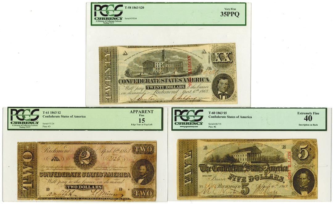 Richmond, VA. Lot of 3 notes. Includes April 6th, 1863. $2, T-61, Issued banknote, S/N 3126 Plate #D, PCGS graded Fine 15; April 6th, 1863. $20, T-58, Issued banknote, S/N 39244, PCGS graded Very Fine 35 PPQ; and, April 6th, 1863. $5, T-60, Issued banknote, S/N 26735 Plate #E, PCGS graded Extremely Fine 40. (3)
