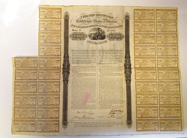 Confederate States (Issued in England), 1863, £100 Pounds Sterling = £2,500 Francs, Series D, 7% Cotton Loan, Issued and Uncancelled Bond, Black ornate border, Allegorical woman top center by cotton bales holding a Confederate flag while the sun rises (or sets) over the ocean, S/N 1761, VF to Choice VF condition. Scarce, attractive and popular Confederate issue.