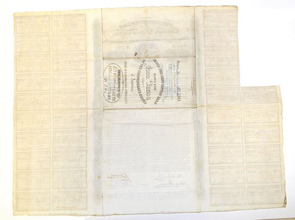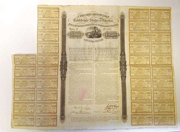 Confederate States (Issued in England), 1863, £100 Pounds Sterling = 2,500 Francs, Series D, 7% Cotton Loan, Issued and Uncancelled Bond, Black ornate border, Allegorical woman top center by cotton bales holding a Confederate flag while the sun rises (or sets) over the ocean, S/N 1761, Missing 4 coupons on the upper left corner. VF to Choice VF condition. Scarce, attractive and popular Confederate issue.