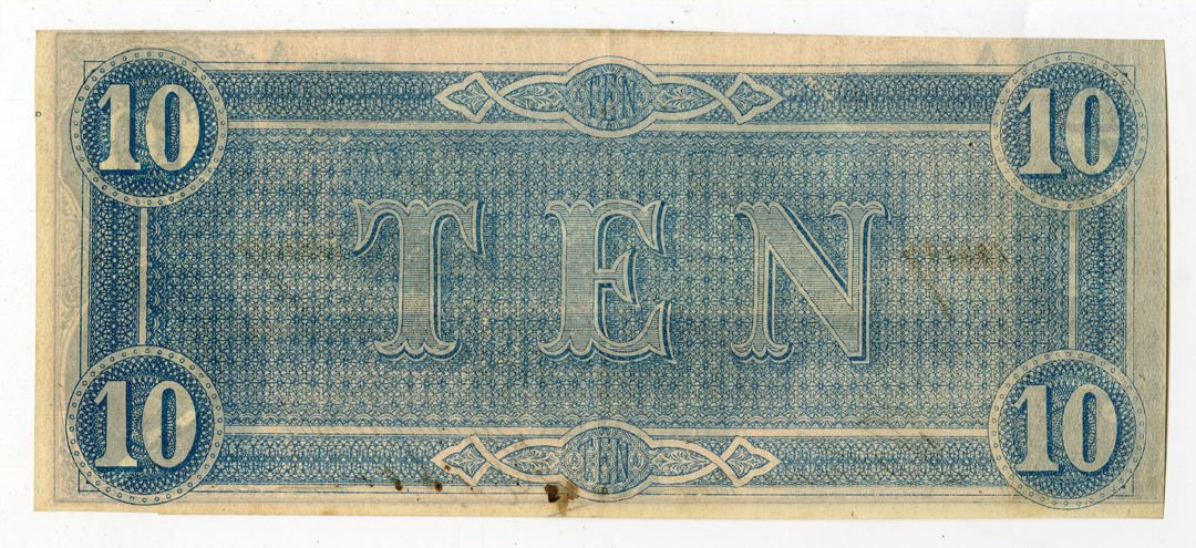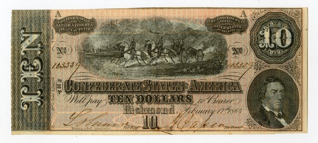 Richmond, Virginia,, Confederate States of America, 1864. $10, P-68 SL #69, Issued Banknote, Black on red underprint with artillery horseman pulling cannon at top center, Portrait of M. T. Hunter at bottom right corner, Back is blue, S/N 103339, AU condition, K&B.