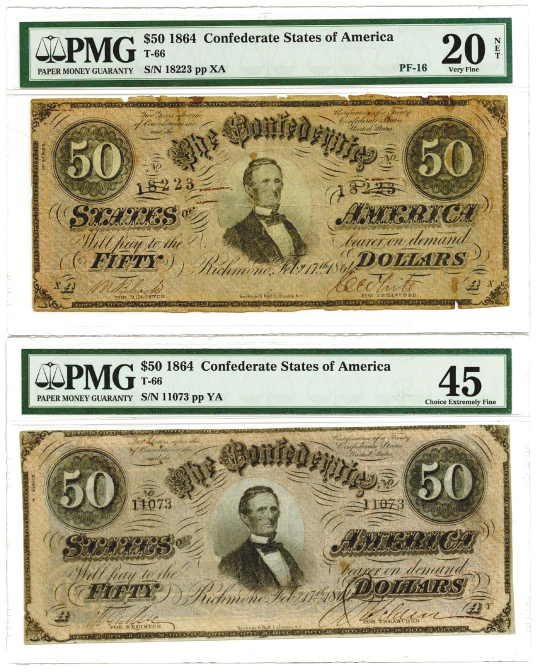 Richmond, VA. Lot of 2 notes. Includes February 17th, 1864. $50, T-66, Issued banknote, S/N 18223 pp XA, PMG graded Very Fine 20 Net; and, February 17th, 1864. $50, T-66, Issued banknote, S/N 11073 pp YA, PMG graded Choice Extremely Fine 45. (2)