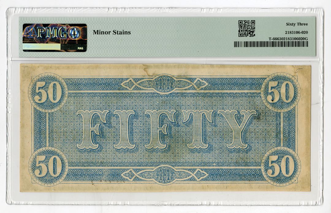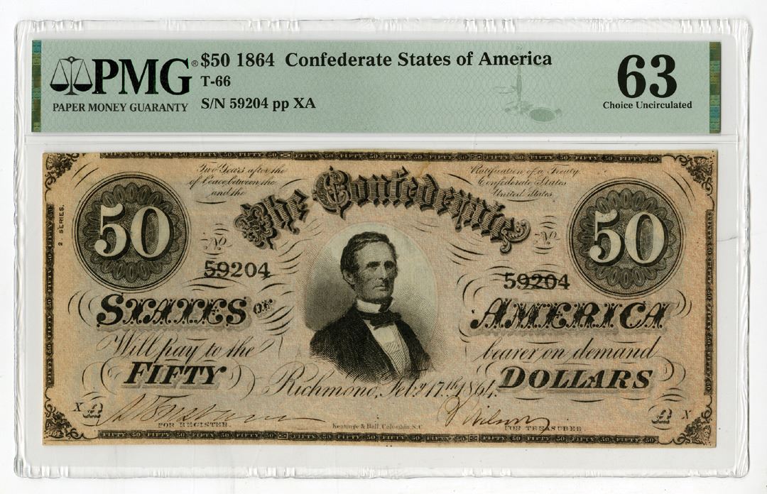 Richmond, Virginia, 1864. $50, T-66, P-70, Black on Red underprint, Portrait of President Jefferson Davis at center, S/N 59204 pp XA, PMG graded Choice Uncirculated 63 with comment "Minor Stains," Keatinge & Ball.