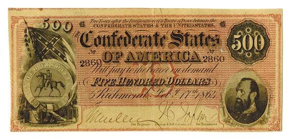 Richmond, VA. 1864 $500, T-64, issued, Black on light red, S/N 2860, Plate B, AU with a small hole on the upper right and a 4mm split on the top middle light fold, otherwise 3 large margins with the bottom margin just touching on the bottom left. K&B.