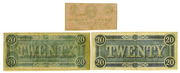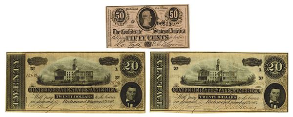 Richmond, Virginia. 1864, Lot of 3 notes, Includes 50 cents, T-72, Uncirculated condition; and 2 examples of 1864 Issue $20 pair, T-67, Both crisp XF to AU condition.
