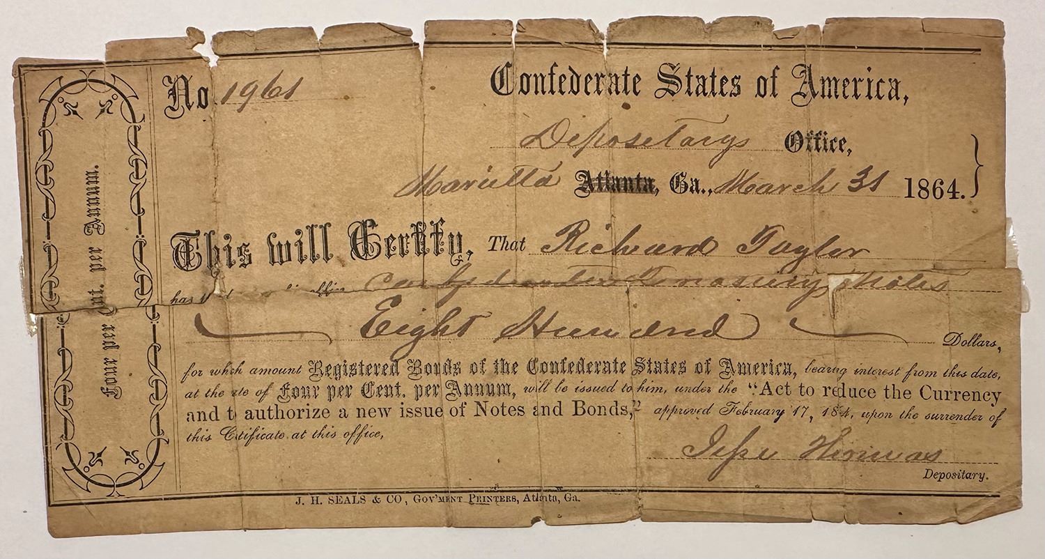 C.S.A. Depositary Office in Marietta (Atlanta crossed out), Georgia, March 31, 1864, $800 deposit receipt for 4% C.S.A. Bonds. S/N 1961, Repaired with the receipt split in half horizontally and taped back together. J.H. Seals & Co., Gov'ment Printers, Atlanta, Ga.