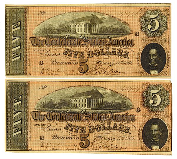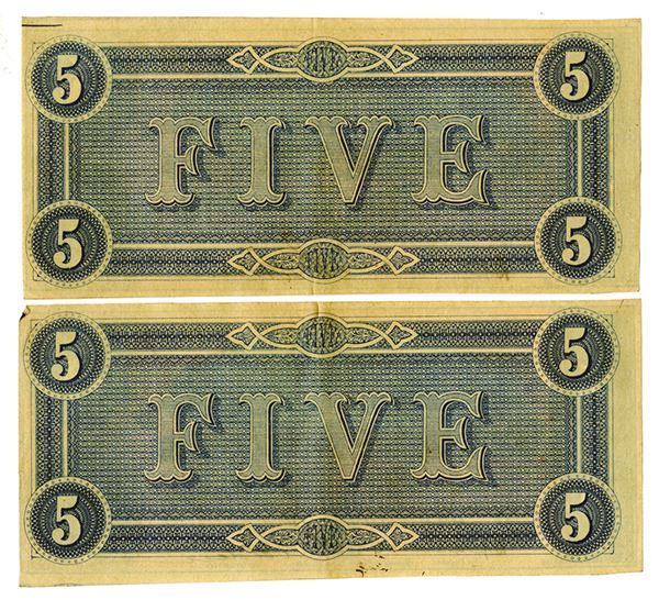 Richmond, VA. Lot of 2 notes, both sequential 1864 $5, T-69 notes, both with very light middle vertical folds keeping them from Uncirculated condition, attractive pair with one having a 3mm split in the top middle fold. S/N's 43746 & 43747, Both are 1st Series, Plate G. Small number "42" on lower left, K&B on bottom and Litho by E&C on left.