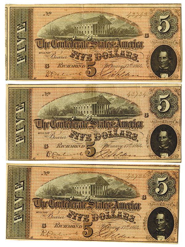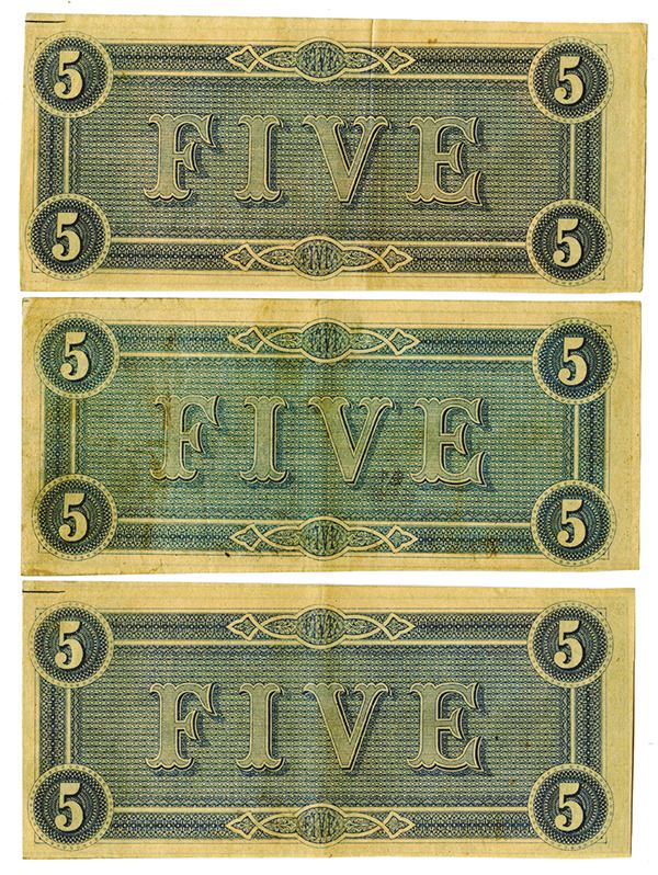 Richmond, VA. Lot of 3 notes, two are sequential 1864 $5 notes and one additional note, All are T-69 notes, 2 with very light middle vertical folds keeping them from Uncirculated condition, attractive pair with the third having a 1.3 inch split in the top middle vertical fold which could be repaired. All with crisp paper and sharp corners, All are 1st Series, Plate G. Small number "42" on lower left, K&B on bottom and Litho by E&C on left.