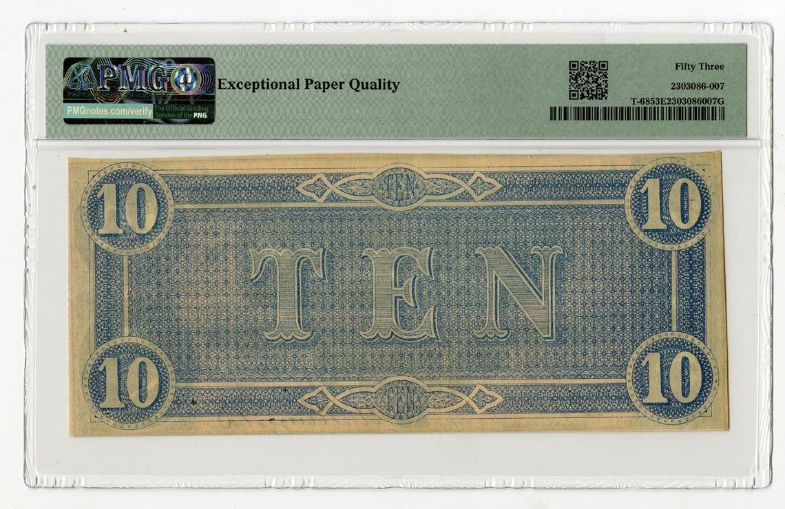 Richmond, Virginia, 1864. $10, T-68 P-68, Issued Banknote, Black on red underprint, Artillery horseman pulling cannon at center with portrait of M.T. Hunter at lower right, Back is blue with TEN printed at center, S/N 61558 pp C, PMG graded About Uncirculated 58 EPQ, Keating & Ball.