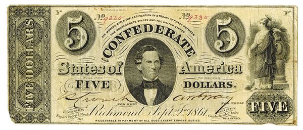 Richmond, Virginia. 1861, $5, T-34, Cr-262A, Memminger portrait in middle, error spelling "Reoeivable", Cut cancel, S/N 9335, VF condition, Scarce error note.