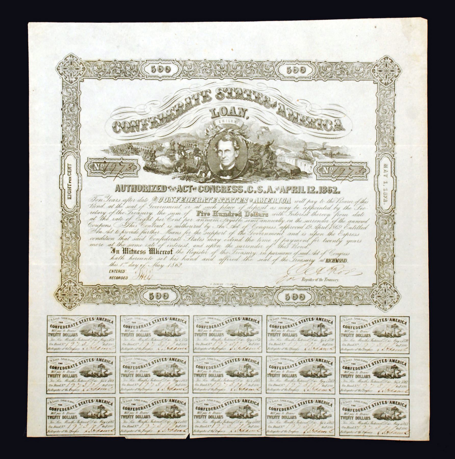 Richmond, Virginia. $500 Bond, S/N 1973, Signed by Rose. Black text with black border, C.G. Memminger at center amid Shiloh-related images. VF condition. Rarity 4- with 751 to 1000 extant, 5541 issued. Imprint: B. Duncan. Columbia. S.C.