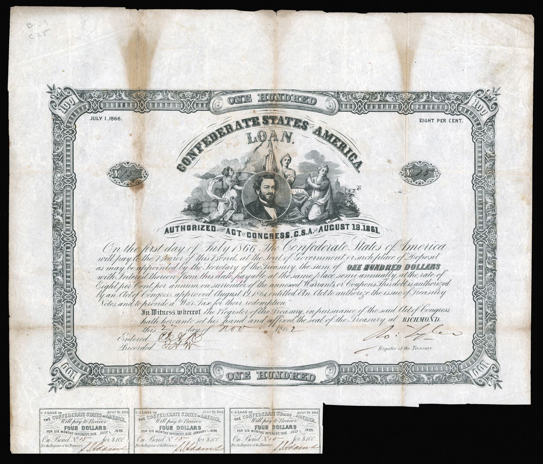 Richmond, Virginia. $100 Bond Issued November 27th, 1862, Very low S/N 15, Signed by Tyler. Lithographed, Black text with black border, Judah P. Benjamin center flanked by 3 women. Fine condition with toning along fold lines and margins, as well as annotations at top left corner. Rarity 6- with 75 to 100 extant. Imprint: B. Duncan. Columbia, S.C.