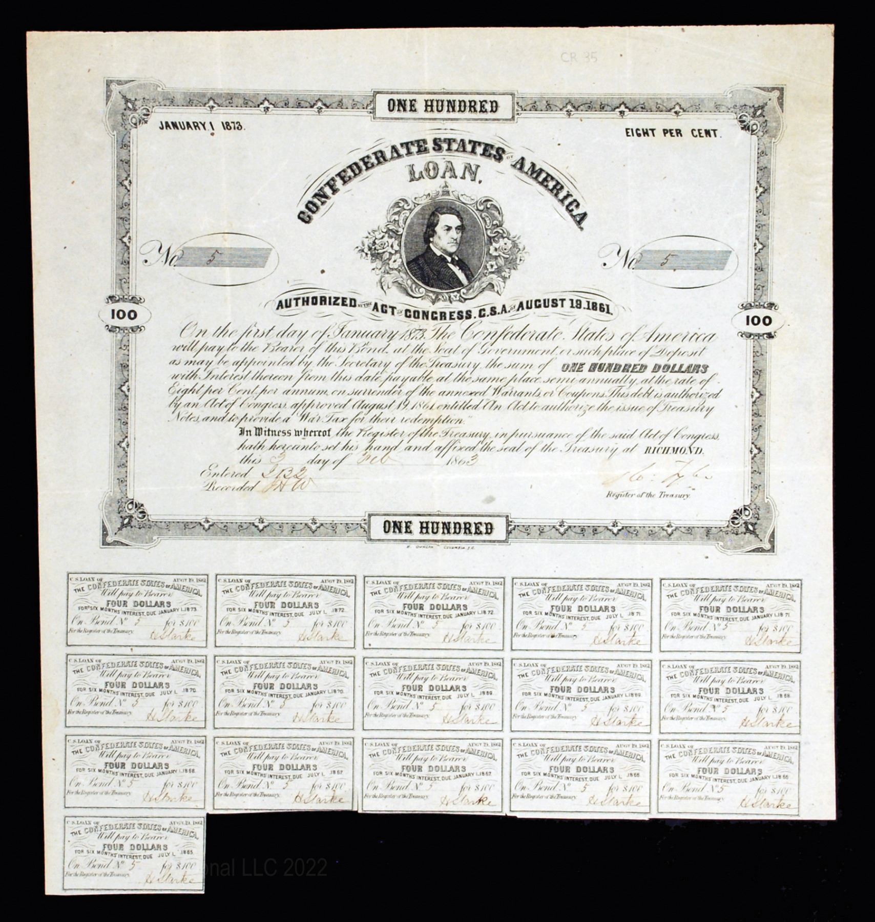 Richmond, Virginia. $100 Bond Issued February 3rd, 1863, Very low S/N 5 out of 846, Signed by Tyler. Lithographed, Black text with black border, R.M.T. Hunter at center. VF condition with some toning and an annotation at top, uneven margin at top. Rarity 5 with 201 to 350 extant, 846 issued. Imprint: B. Duncan. Columbia. S.C.
