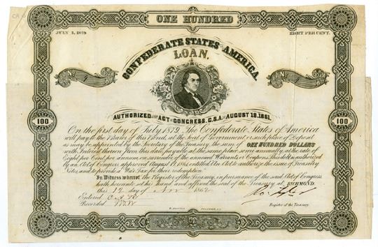 Richmond, Virginia. C.S.A. Act of August 19th, 1861, $100 Bond Issued November 12th, 1862, (T97-B119, Cr.45), Low S/N 9 out of 1399, Signed by Tyler. Lithographed, Black text with black border, R.M.T. Hunter at center. VF condition with toning, uneven margin at top and right, annotation at top left. Rarity 5 with 201 to 350 extant, 1399 issued. Imprint: B. Duncan Columbia S.C. Low S/N, Rare.