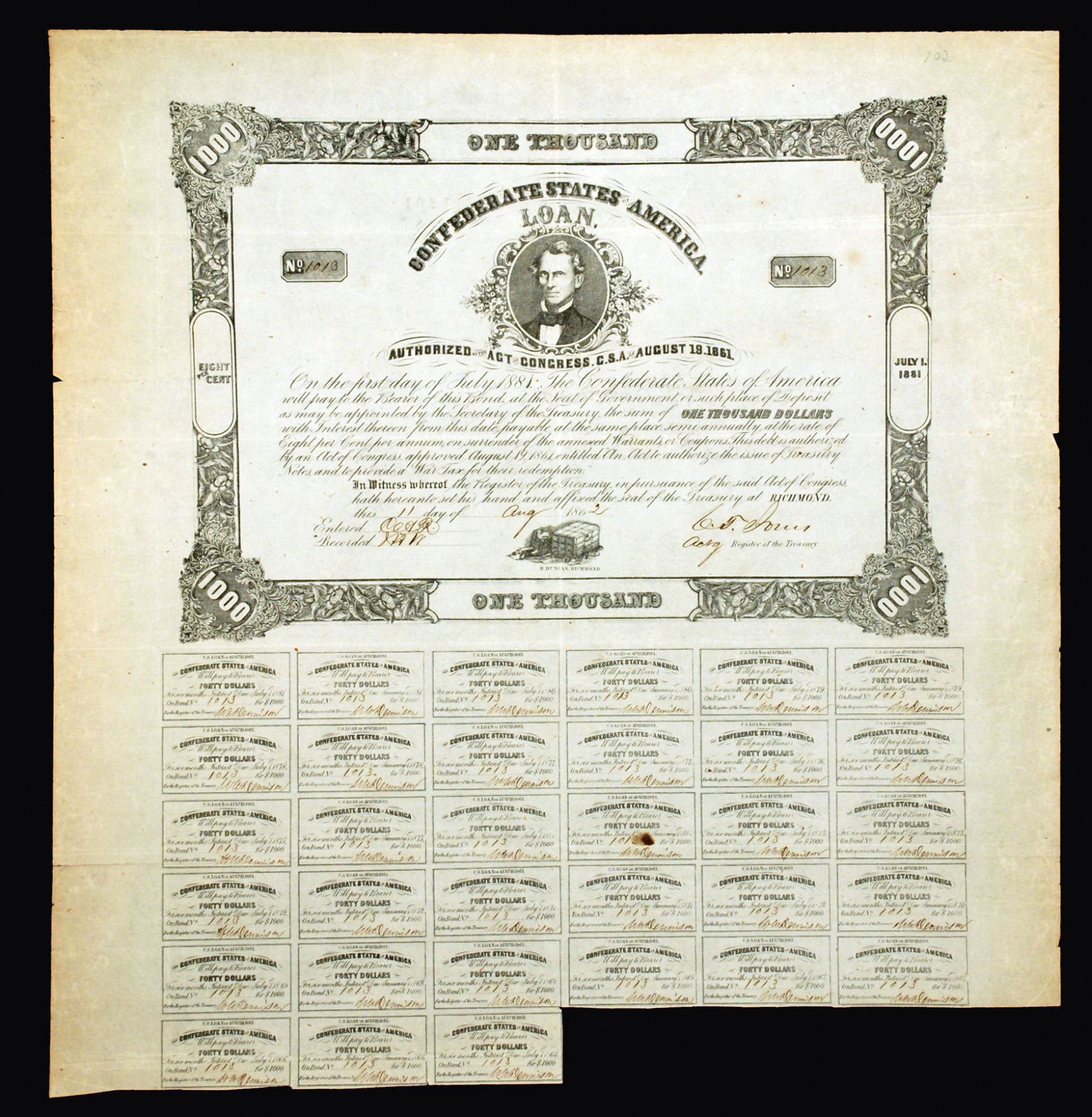 Richmond, Virginia. $1000 Bond Issued August 11th, 1862, S/N 1013 out of c. 1001 to 2000, Signed by Jones. Lithographed, Black text with black border, C.G. Memminger at center. VF condition with toning, annotation at top right corner, small stain at bottom center, small missing pieces at center left and right. Rarity 4+ with 501 to 750 extant, 3457 issued. Imprint: B. Duncan. Richmond.