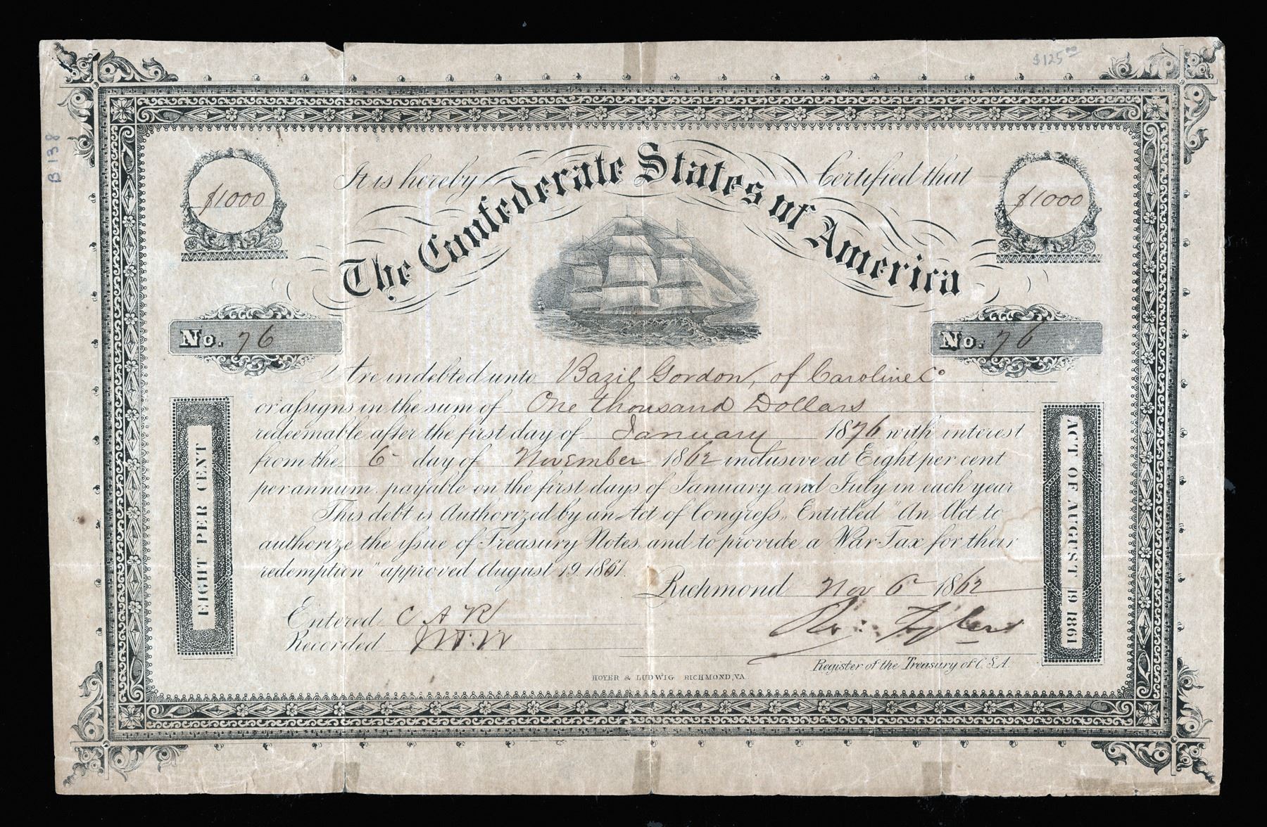 Richmond, Virginia. $1000 Bond Issued November 6th, 1862, Due Date is January 1, 1876. Signed by Tyler. Black text with black border, Printed on white paper, Sailing ship at top center. The 1876 Due Date is considered a Rarity 7 bond with no more than 11 to 20 existing. Fine to VF condition with toning, aging, archival tape repairs around margins, and annotation at top right corner. Imprint: Hoyer & Ludwig Richmond, VA.