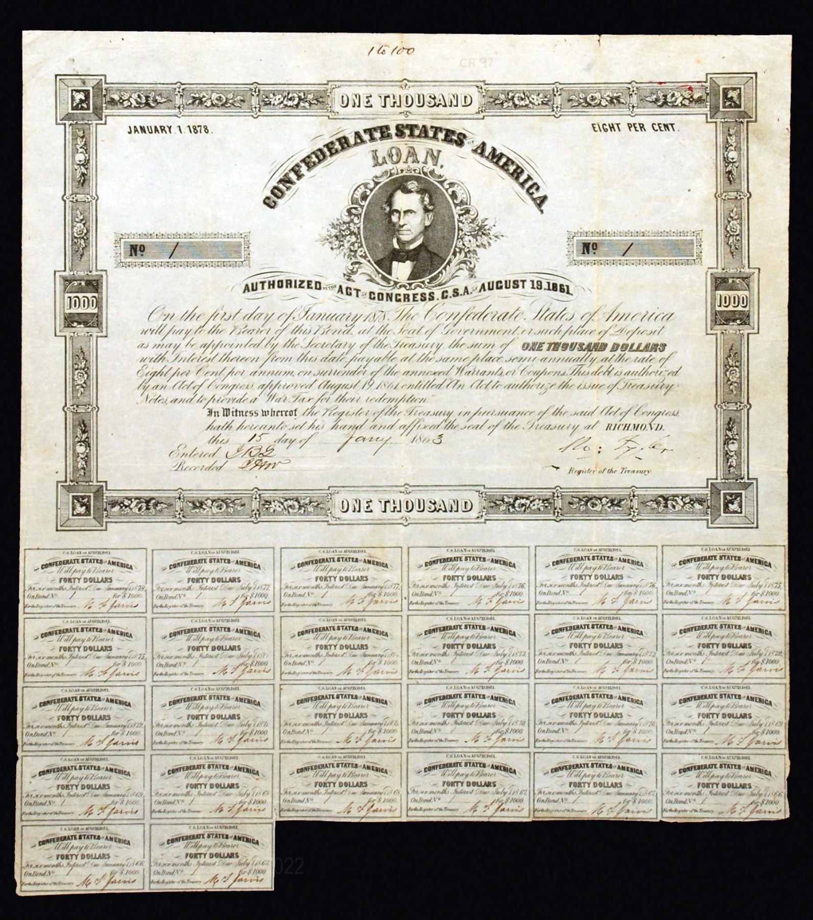 Richmond, Virginia. $1000 Bond Issued January 15th, 1863, S/N 1, First issue, Signed by Tyler. Lithographed, Black text with black border, C.G. Memminger looking left. Fine-VF condition with toning, split at top right margin, writing at top center. Rarity 4+ with 501 to 750 extant, 2702 issued. No imprint. Rare first issue of bond for this variety.