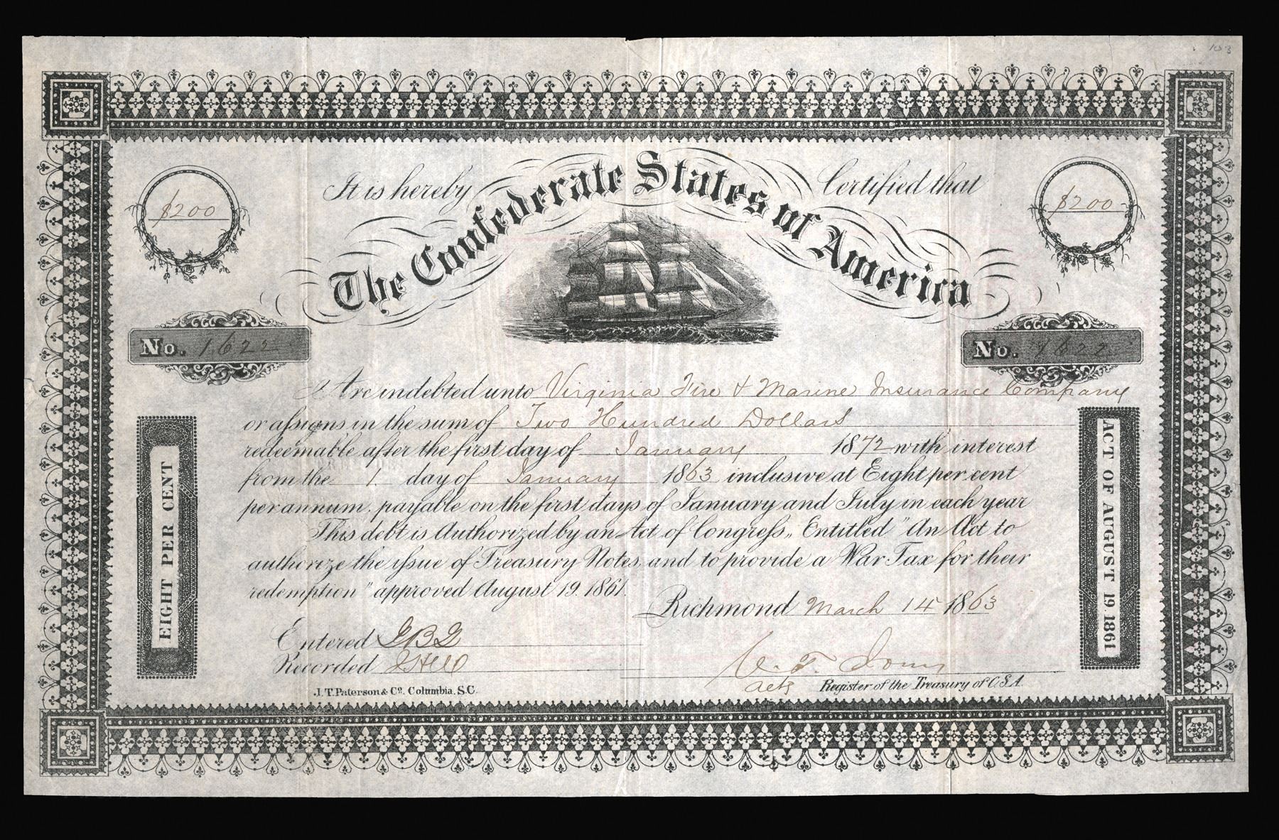 Richmond, Virginia. $200 Bond Issued March 14th, 1863, Due Date is January 1, 1872, S/N 1622, Signed by Jones. Black text with black border, Printed on white paper, Sailing ship at top center. This bond has an R-7 rarity, Fine-VF condition with toning, annotation at top right corner. Imprint: J.T. Paterson & Co. Columbia. S.C.