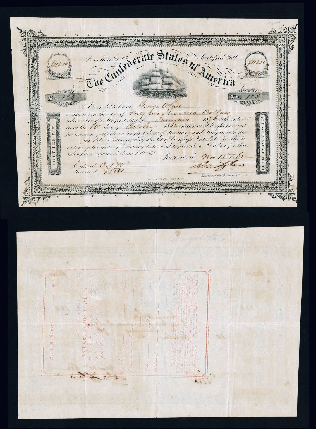 Richmond, Virginia. $4200 Bond Issued November 11th, 1862, Due Date ?????? S/N 123, Signed by Tyler. Black text with black border, Printed on white paper, Sailing ship at top center. Fine condition with toning and uneven margins. Imprint: Hoyer & Ludwig Richmond, VA.