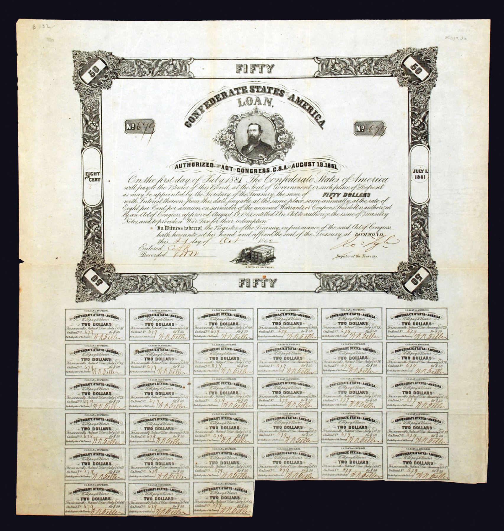 Richmond, Virginia. $50 Bond Issued October 21st, 1862, S/N 679 out of 1 to 2059, Signed by Tyler. Lithographed, Black text with black border, Unknown man in wreath at center. VF condition, toning, annotations at top left and right, small piece missing from middle left margin. Rarity 5- with 351 to 500 extant, 2059 issued. Imprint: B. Duncan. Richmond.