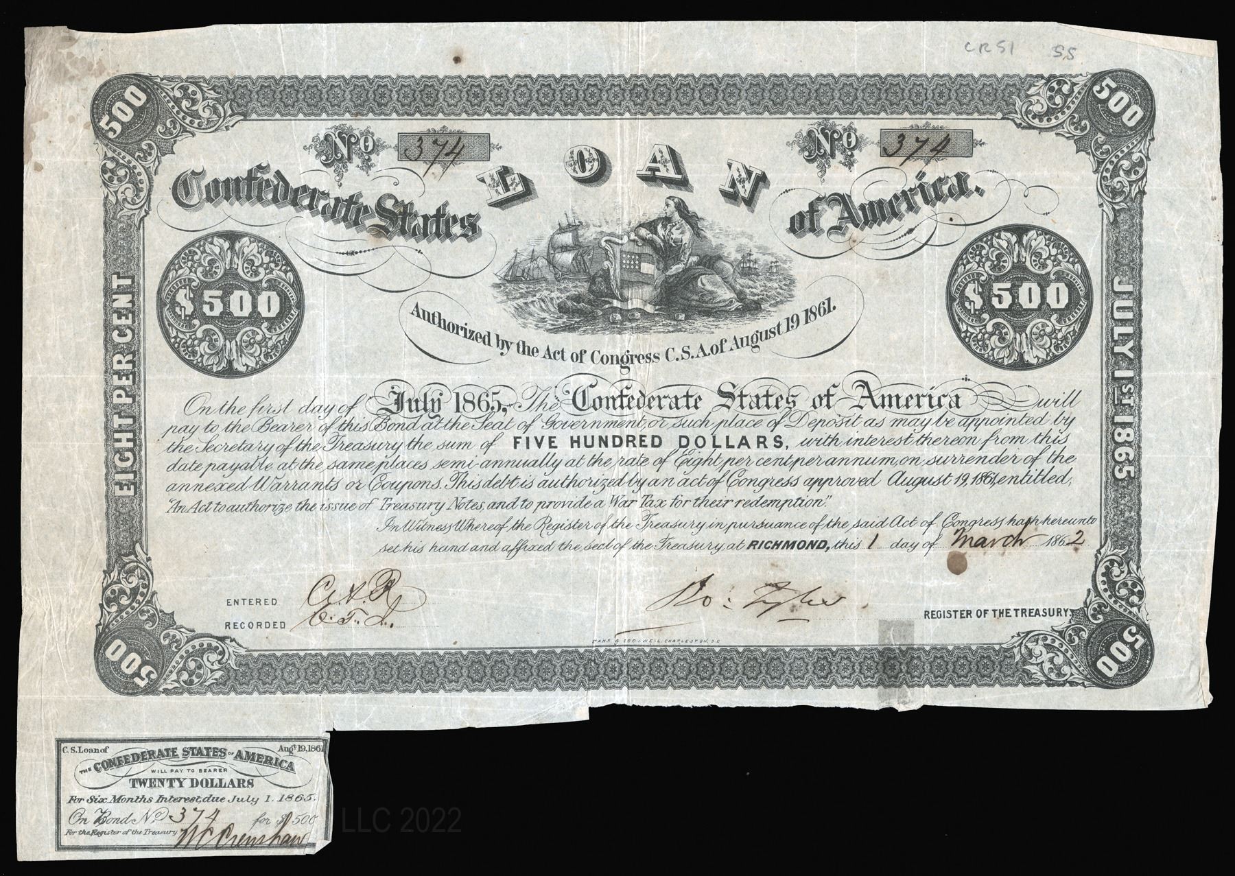 Richmond, Virginia. $500 Bond Issued March 1st, 1862, S/N 374 out of c. 31 to 742, Black text with black border, Confederacy with flag (on shield) and ships, Signed by Tyler. Fine condition with ink stains, toning along fold lines, uneven margins, and annotations at top right corner. Rarity 5+ with 101 to 200 extant, 834 printed. Imprint: Evans & Cogswell, S.C.