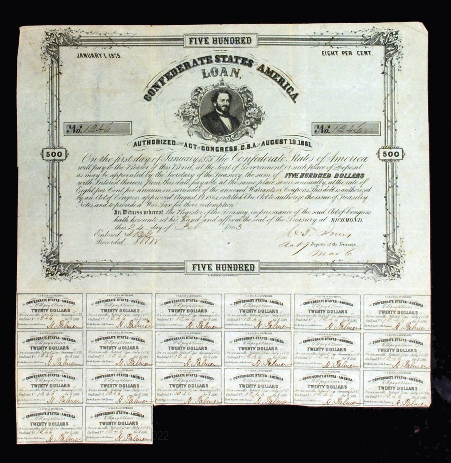 Richmond, Virginia. $500 Bond Issued February 24th, 1863, S/N 1246 out of 801 to 1250, Signed by Jones. Lithographed, Black text with black border, J.P. Benjamin at center. VF condition with toning. Rarity 5- with 351 to 500, 1600 issued. Imprint: B. Duncan. Columbia. S.C.