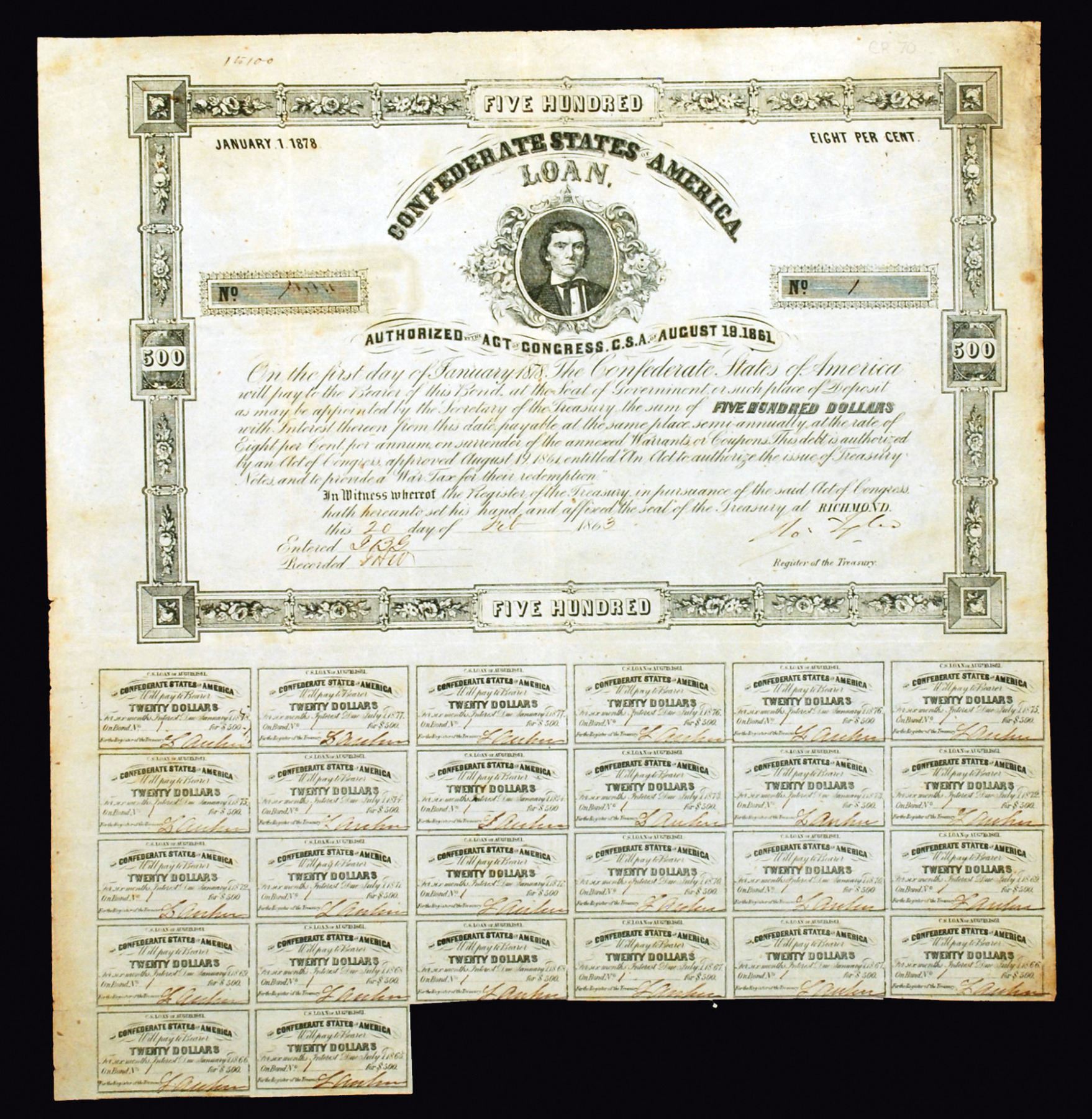 Richmond, Virginia. $500 Bond Issued February 20th, 1863, S/N 1, Very first issue, Signed by Tyler. Lithographed, Black text with black border, A.H. Stephens at center. Fine-VF condition with toning, staining around right margin, annotation at top margin. Rarity 5 with 201 to 350 extant, c. 1671 issued. No imprint. First bond issued for this variety. Rare.