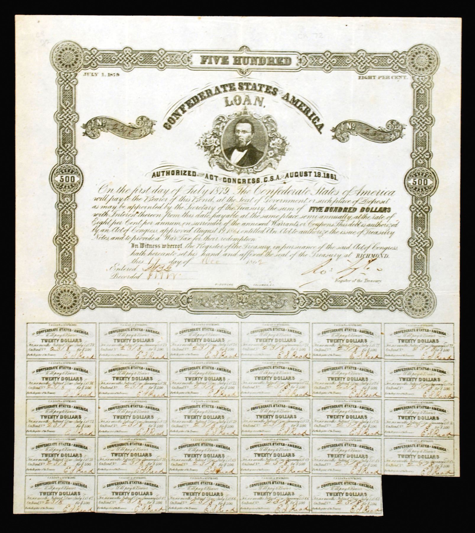 Richmond, Virginia. $500 Bond Issued December 19th, 1862, S/N 2318 out of 2576, Signed by Tyler. Lithographed, Black text with black border, T.H. Watts at center. VF condition with annotation at top left corner, and faint toning along center fold line, otherwise in great condition. Rarity 4+ with 501 to 750 extant, 2576 issued. Imprint: B. Duncan, Columbia, S.C.