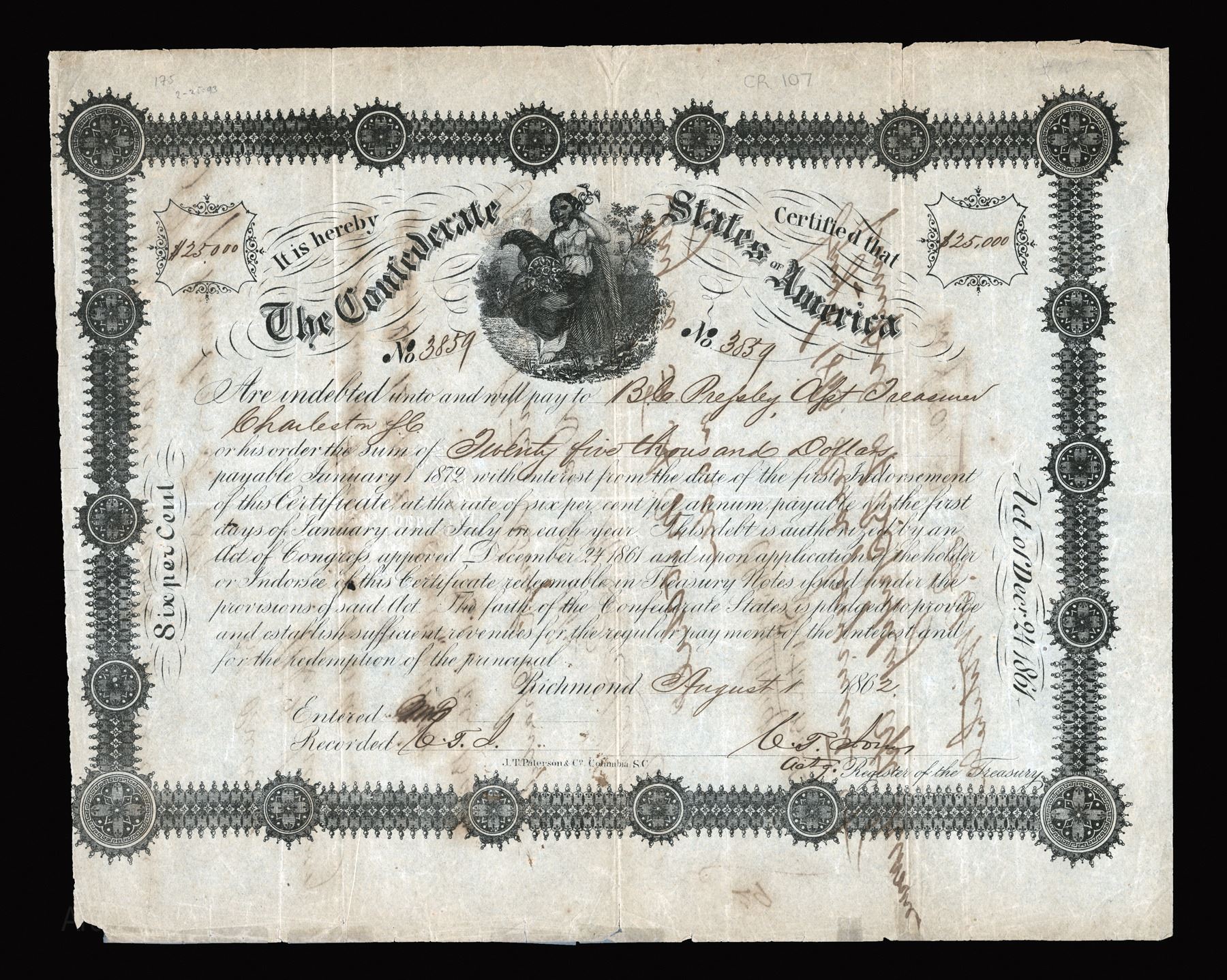 Richmond, Virginia. $25,000 Bond Issued August 1st, 1862, S/N 3859 out of 1801 to 7699, mostly odd numbers, Signed by Jones. Black text with black border variety 2, Commerce with cornucopia at center. Fine condition with aging, toning, annotations at top margin, and ink bleed from handwritten payment details on back. Rarity 6- with 76 to 100 extant, c. 1950 issued. Imprint: J.T. Paterson & Co. Columbia. S.C.