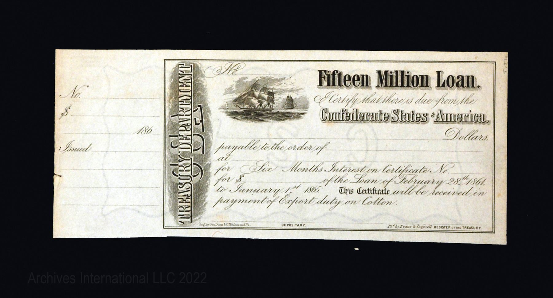 Richmond, Virginia. Unissued Stock Certificate Interest Form, Without S/N and Signature. Lithographed, Black text with black border, Ship at top left, Printed on white paper watermarked "CSA" in block letters with wavy border line. VF condition with some toning around margins, possible annotation or imprint at top right corner. Unknown Rarity as a remainder. Imprint: Eng. by Geo. Dunn & Co. Richmond. Va. at left; and right, Ptd By Evans & Cogswell.