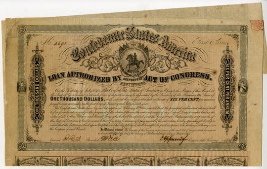 Richmond, Virginia. C.S.A. Act of February 17th, 1864, $1000 Bond, S/N 2695, Signed by Apperson. Black text with black border, Confederate seal at top center, Black over pink to dark red tint plate. 1 coupon is missing. Fine to VF condition with toning, uneven margin at bottom. Rarity 4 with 1001 to 1500 extant, c. 8200 issued. Left imprint: Engraved by J. Archer, Richmond, VA; Right imprint: Printed by Evans & Cogswell, Columbia, S.C