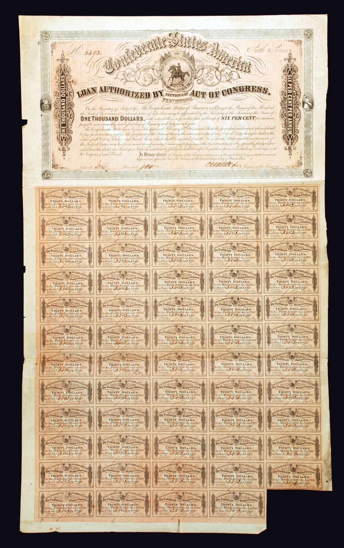 Richmond, Virginia. $1000 Bond, S/N 2492 out of 1 to 10,050, Signed by Apperson. Black text with black border, Confederate seal, Black over pink to dark red tint plate. Sixth Series. VF condition with some pieces missing from margins and toning. Rarity 3 with 2501 to 5000 extant, c. 10,050 issued. Left Imprint: Engraved by J. Archer, Richmond, Va.; Right Imprint: Printed by Evans & Cogswell, Columbia, S.C.