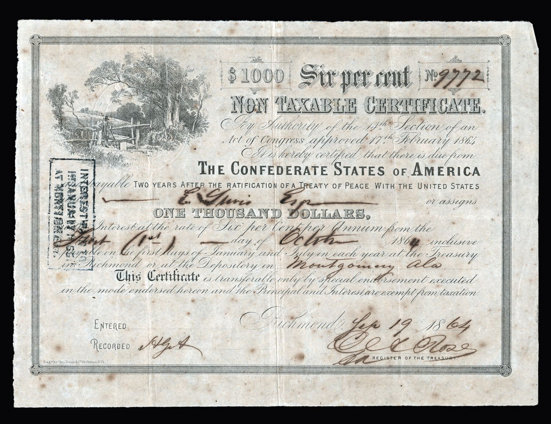 Richmond, Virginia. $1000 Bond Issued September 19th, 1864, S/N 9772 out of c. 1 to 25,000, Signed by Rose. Black text with black border, Man and turnstile at top left corner, Printed on white paper, Long transfer form on back. Fine-VF condition with toning and foxing. Rarity 3 with 2501 to 5000 extant, c. 25,000 issued. Imprint: Engd. by Geo. Dunn & Co. Richmond Va.