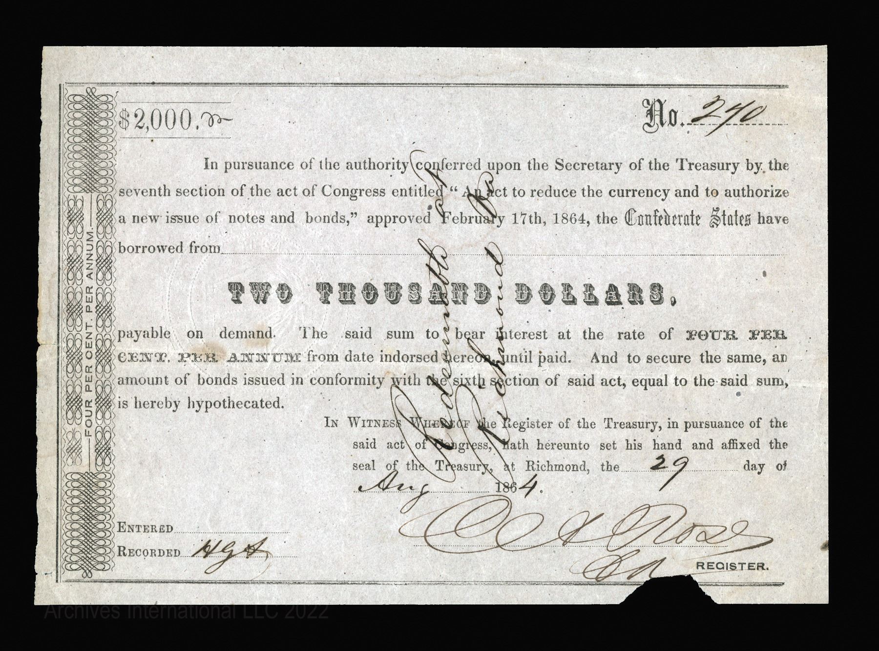 Richmond, Virginia. $2000 Call Certificate, 4%, Issued August 29, 1864, S/N270, Rose Signature, Rarity R 6, VF to Choice VF condition.