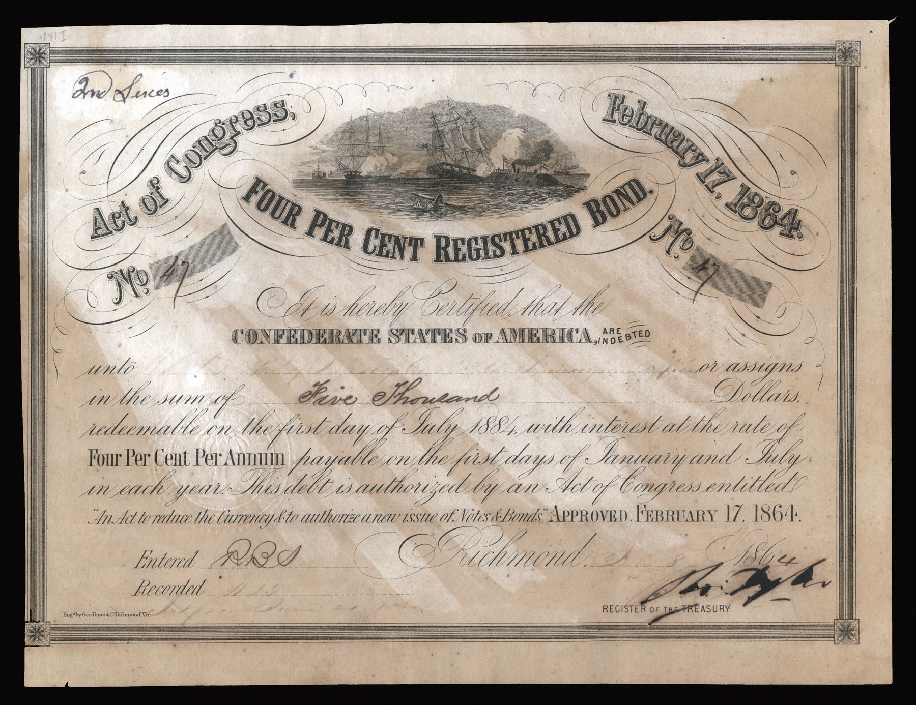 Richmond, Virginia. $5000 Bond Issued July 8th, 1864, S/N 47 out of c. 1 to 62, Signed by Tyler. Lithographed (presumed), Black text with black border, CSS Virginia sinking USS Cumberland at top center, Printed on plain white paper. "2nd Series" handwritten at top left corner. Fine condition with toning and strange discoloration, annotation at top left corner. Rarity 7+ with 4 to 10 extant, c. 62 issued. Imprint: Engd. By Geo. Dunn & Co. Richmond. Va. Rare.