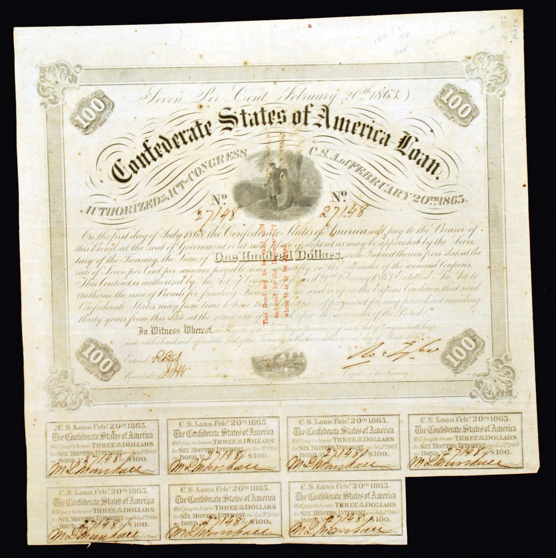 Richmond, Virginia. $100 Bond, S/N 27148 out of 27,001 to 27,600, Signed by Tyler. Black text with black border, CSA officer overlooking the Rappahannock west of Fredericksburg at top center, Printed on dark pink paper. Three-lined red overprint on face and endorsed on back by H.J.G. Battle, CSA depositary at Shreveport, Louisiana. Fine-VF condition with toning, annotations at top right corner, foxing, and ink bleed from handwriting on back.. Rarity 5 with 201 to 350 extant, c. 600 issued. Imprint: Archer & Daly Richmond Va.