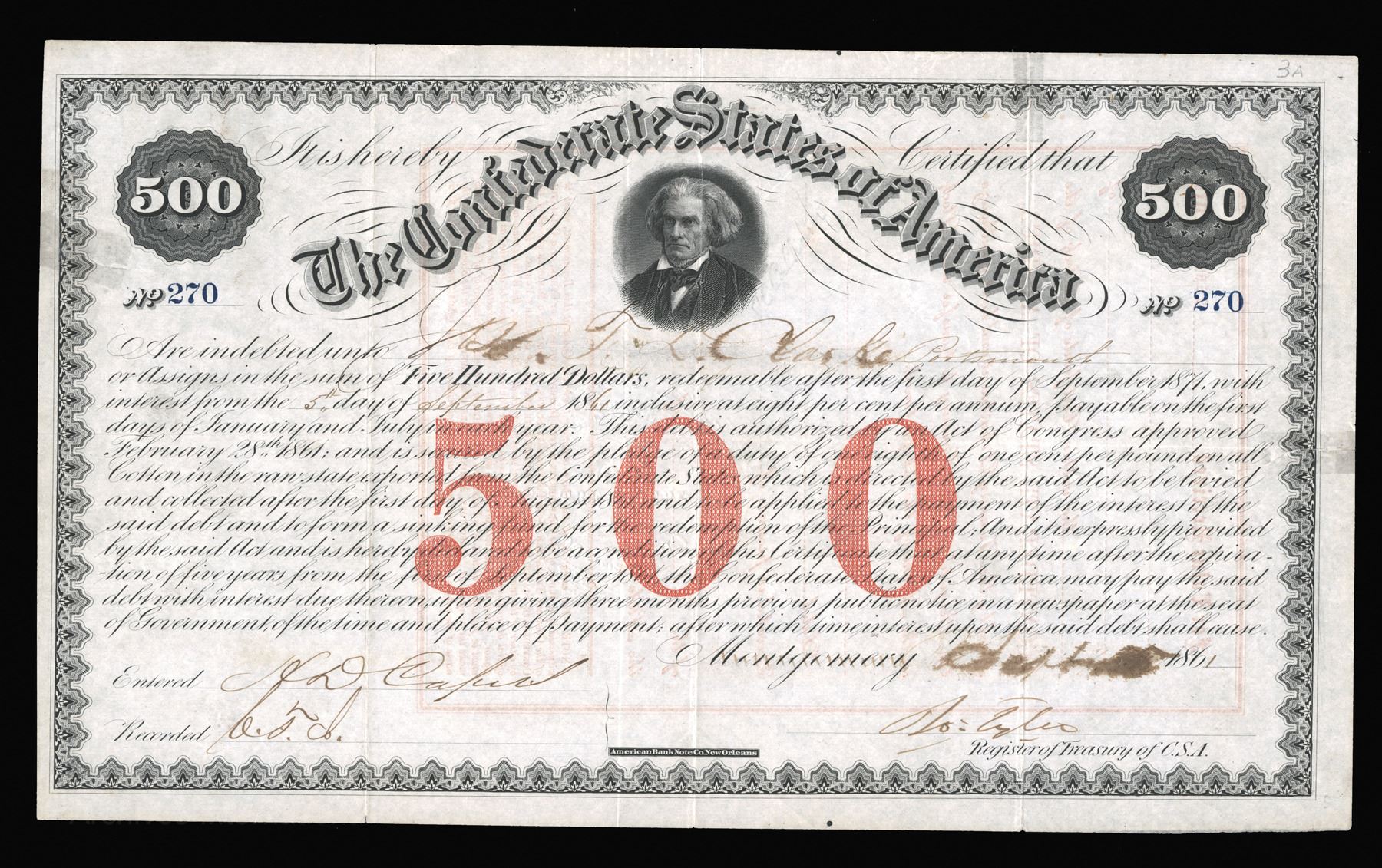 Richmond, Virginia. $500 Bond, Appears to be issued in September of 1861, S/N 270 out of 178 to 491, Intaglio, Letterpress tints with letterpress back, Black text with black border and red underprint, "Montgomery" crossed out, likely with Richmond written in, signed by Tyler. Fine condition with a trio of folds down center, ink of payee's name and date are feathered, archival repairs along margins, annotation top right corner. Rarity 7 with 11 to 20 estimated to be extant. Imprint: American Bank Note Co. New Orleans.