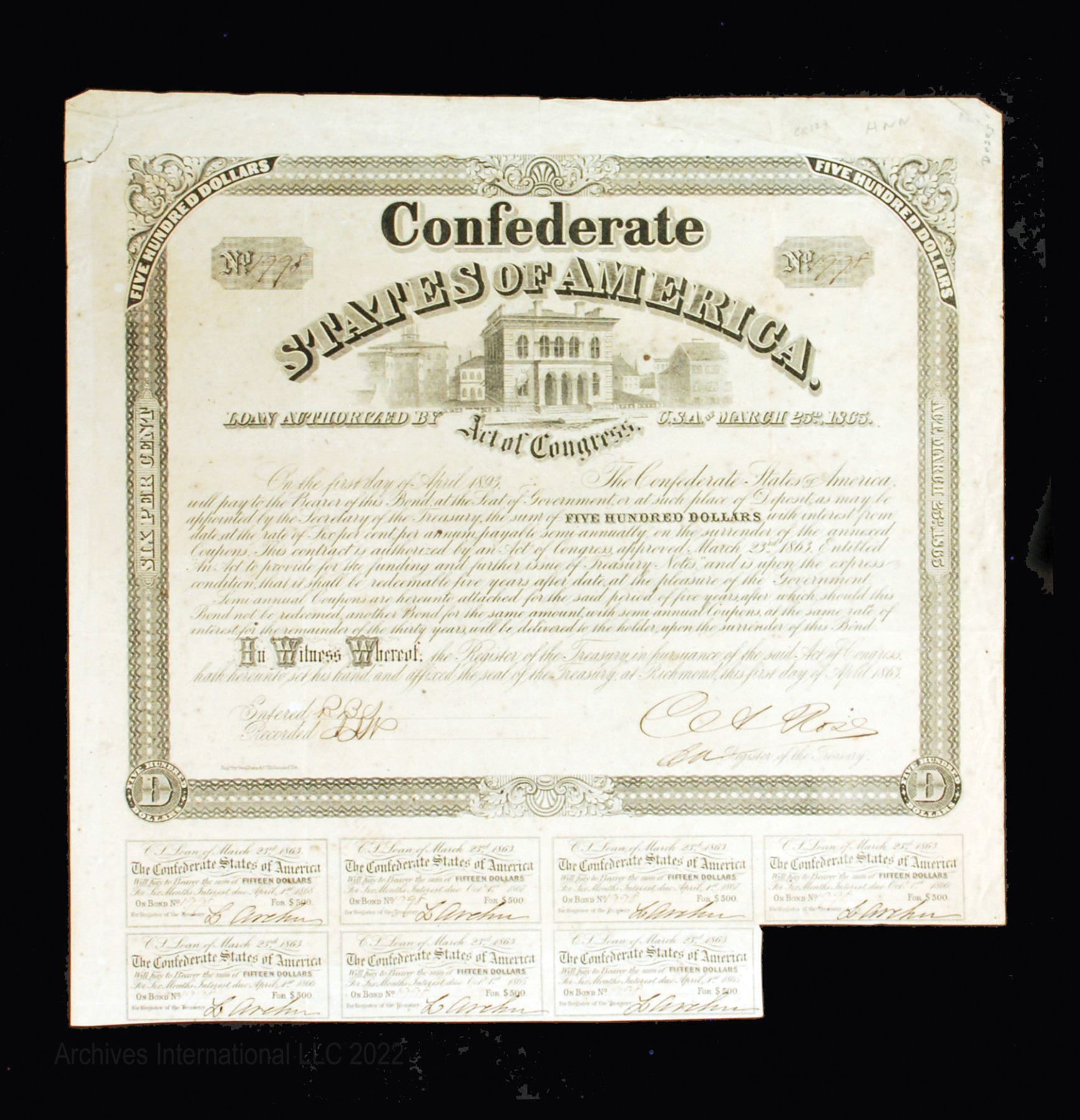 Richmond, Virginia. $500 Bond, S/N 1998 out of 1901 to 2351, Signed by Rose. Lithographed, Black text with black border, Old U.S. Customs House, serving as CSA executive offices and treasury department, Printed on white paper. Fine-VF condition with a large tear at top left corner, annotations at top right corner, and toning. Rarity 5+ with 101 to 200 extant, c. 451 issued. Imprint: Engd. by Geo. Dunn & Co. Richmond, Va.