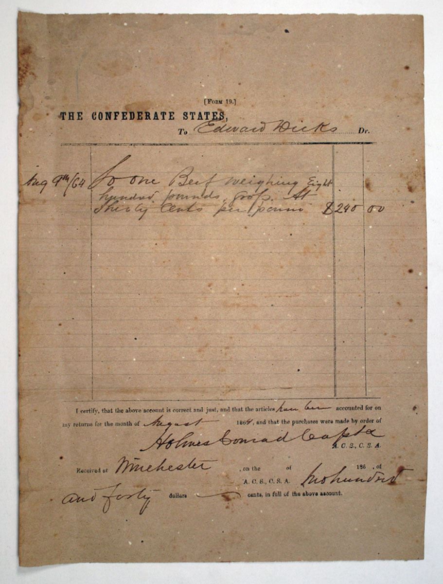 Winchester, Virginia, 1864. Form #19 Invoice paid to Edward Hicks for 800 pounds of Beef at 30 cents a pound. Signed by Holmes Conrad. VF condition. Holmes Conrad (January 31, 1840 – September 4, 1915) was an American politician, lawyer and military officer. At the outbreak of the Civil War he enlisted as a private in Company A, 1st Virginia Cavalry and saw active service throughout the war. He was commissioned a lieutenant and was appointed adjutant in August 1862. In 1864 he became major and assistant inspector general of Thomas Rosser’s cavalry division, serving there until the end of the war.