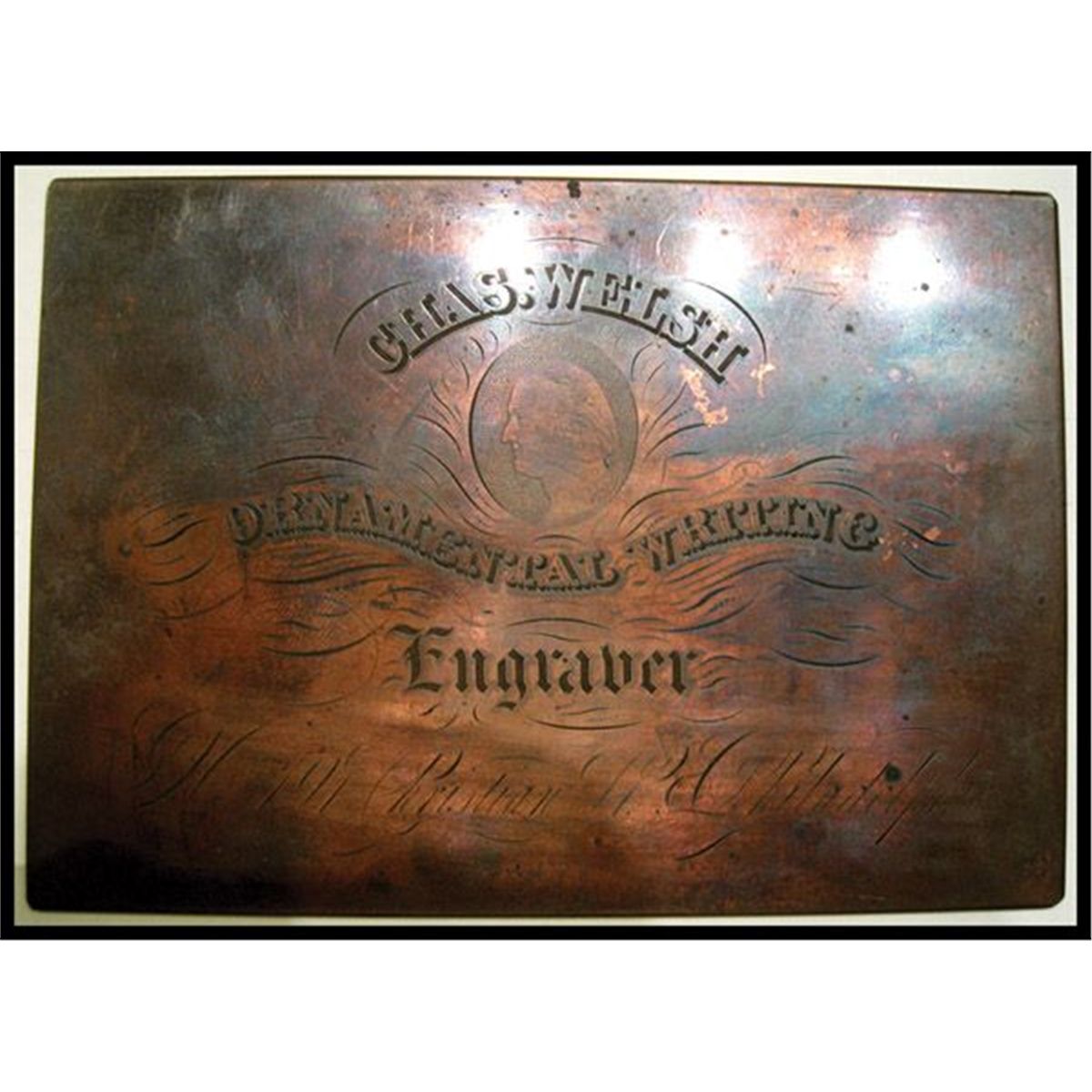 Philadelphia, Pennsylvania, ND (ca.1820's), Copper printing plate with ornate engraved text in various fonts on 3 by 4.25 inch copper plate. The text states “Chas. (Charles) Welsh, Ornamental Writing - No. 191 Christian, Philadelphia “. A profile view of George Washington is in the middle similar to the design used on U.S. postage stamps. Another Unique copper printing plate from a new estate find and the first time ever offered in public auction. The plate is in excellent condition with evidence of previous cleanings long ago since the patina is starting to return, a lovely golden-red color, the back has imprint “J. Hufty Engraver. Philad.” who was part of the well known firm of UBSH “Underwood, Bald, Spencer & Hufty” located in Philadelphia and well known for their early and ornate banknote engraving.